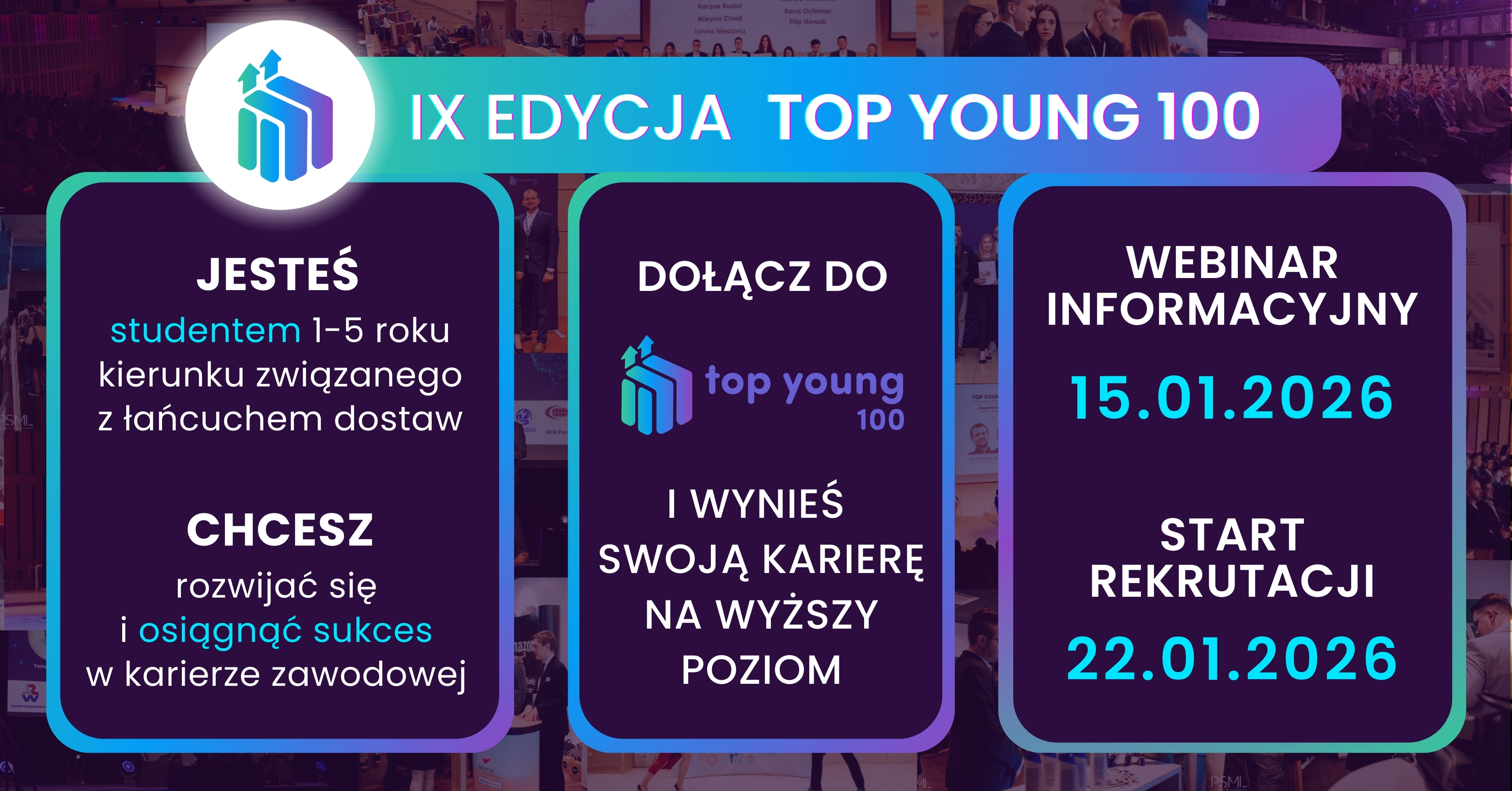 Już 22 stycznia 2026 r. startuje rekrutacja do kolejnej – IX edycji Programu Top Young 100 – ogólnopolskiej inicjatywy dla studentów kierunków związanych z łańcuchem dostaw. To szansa, aby już podczas studiów zdobyć praktyczne doświadczenie, poznać ekspertów z branży i rozwijać swoją karierę.