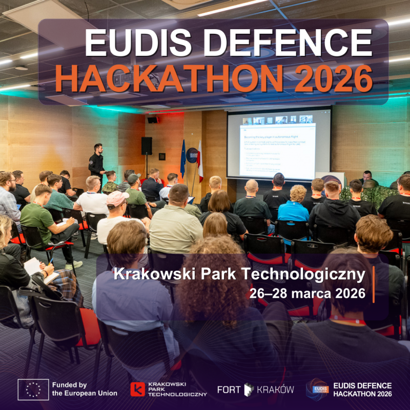 Polska edycja EUDIS Defence Hackathon odbędzie się w dniach 26–28 marca 2026 r. w siedzibie Krakowskiego Parku Technologicznego (ul. Podole 60, Kraków). Przez 48 godzin zespoły będą rozwijać swoje projekty pod okiem mentorów wojskowych, technologicznych i biznesowych.