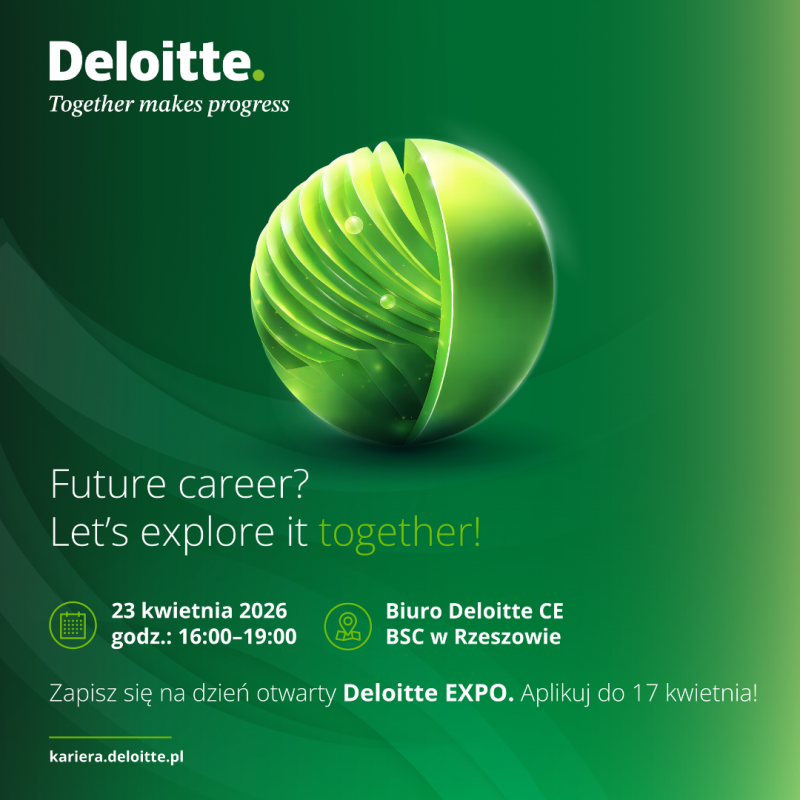 Firma Deloitte zaprasza studentki i studentów do udziału w dniu otwartym rzeszowskiego biura, który odbędzie się 23 kwietnia 2024 r. Wydarzenie ma na celu przybliżenie specyfiki pracy w międzynarodowej organizacji oraz prezentację poszczególnych działów biznesowych.