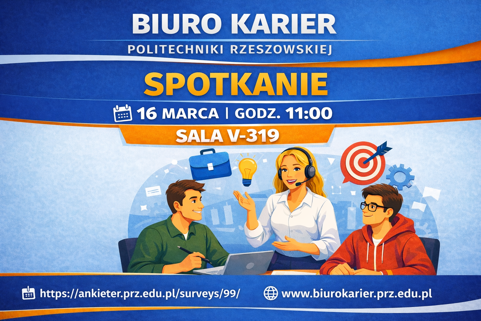 Kursy Zapraszamy studentów oraz absolwentów Politechniki Rzeszowskiej na spotkanie informacyjne poświęcone działalności i zasobom Biura Karier. Celem wydarzenia jest przybliżenie narzędzi wspierających rozwój zawodowy oraz przedstawienie aktualnych inicjatyw podejmowanych przez naszą jednostkę. |