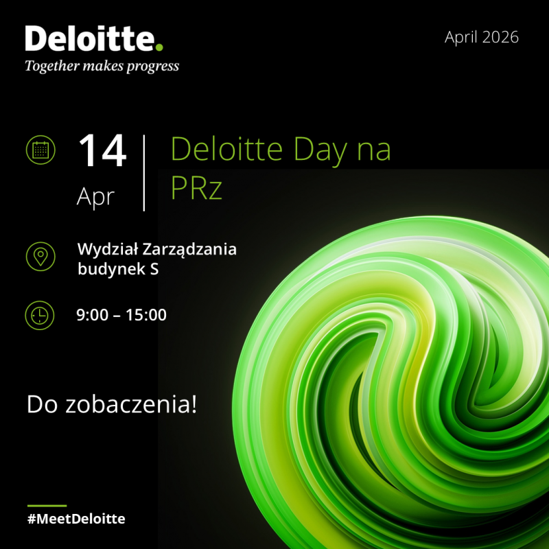 Spotkania z pracodawcami Informujemy, że 14.04.2026 r. w budynku S Wydziału Zarządzania odbędzie się wydarzenie Deloitte Day. Stoisko informacyjne organizatora jest dostępne dla studentów w godzinach 9:00 – 15:00. |